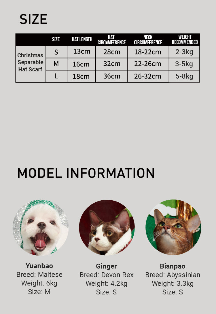 S - Hat Length 13 cm, Hat Circircumference 28 cm, Scarf Length 58 cm, Scarf Width 5 cm, suits for Chihuahua, Maltese, Yorkshire Terrier, cats under 5kg.